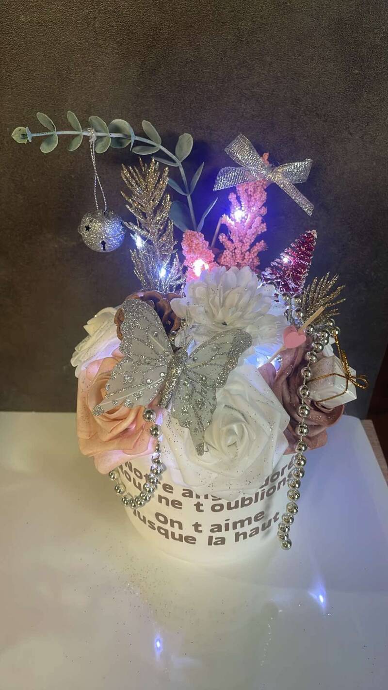 Magnifique pot de Noël, pour poser sur un monument funéraire avec led incorporées. Dans les tons Blanc, Rose, Or, Argentée.